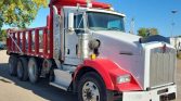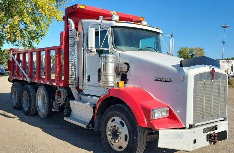 The 2012 Kenworth T800 dump truck has 307,525 miles on the odometer and 14,394 hours on the meter. It is powered by a Paccar 12.9L six-cylinder diesel engine with 455 horsepower and engine brake. The transmission is an Eaton Fuller manual with 10 speeds. The chassis features a double frame with triple axles including a pusher axle, inter-axle differential lock, air suspension with dump valves, and air brakes. It has a PTO.